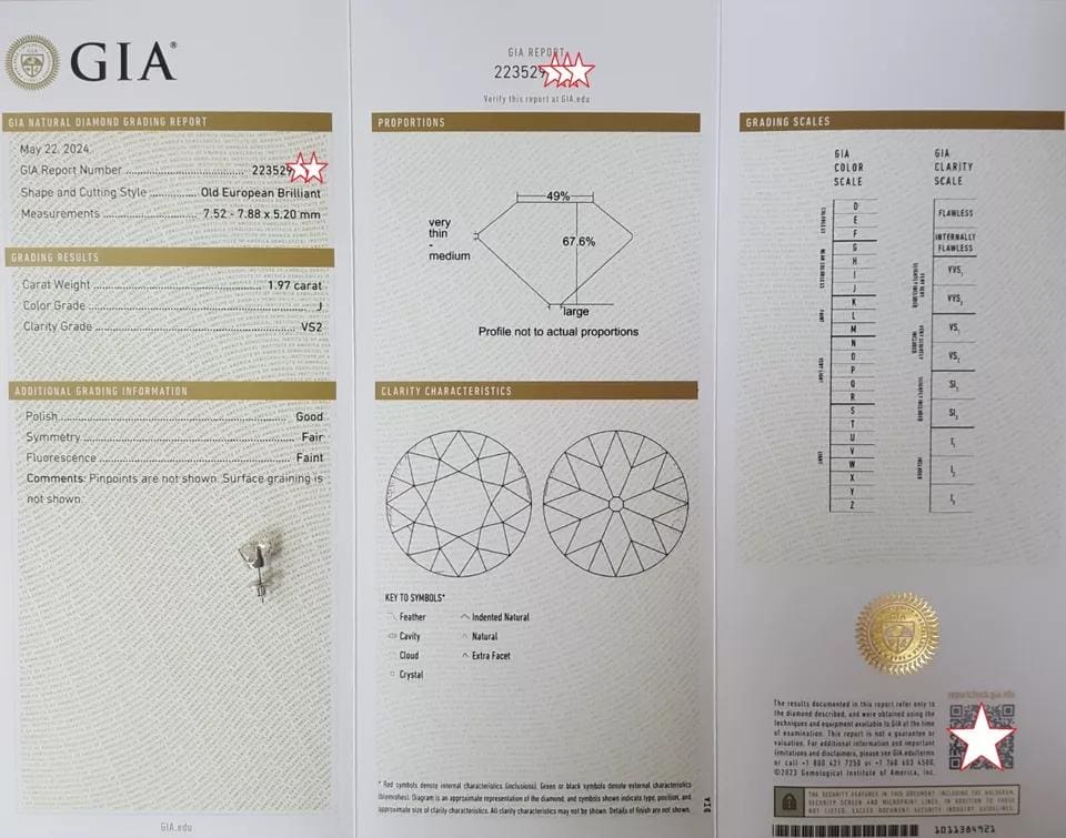 Stone #1: Natural 1.97 ct Old European Cut Diamond, J in color, VS2 in clarity, Good Polish, Fair Symmetry, 67.6 % Depth, Fair Fluorescence, Measuring 7.52-7.88x5.20 mm, graded by GIA "GIA 223529****".