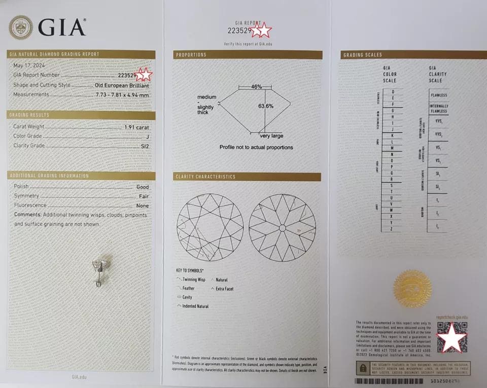 Stone # 2: Natural 1.91 ct Old European Cut Diamond, J in color, SI2 in clarity, Good Polish, Fair Symmetry, 63.6% Depth, None Fluorescence, Measuring 7.73-7.81x4.94 mm, graded by GIA "GIA 223529****".