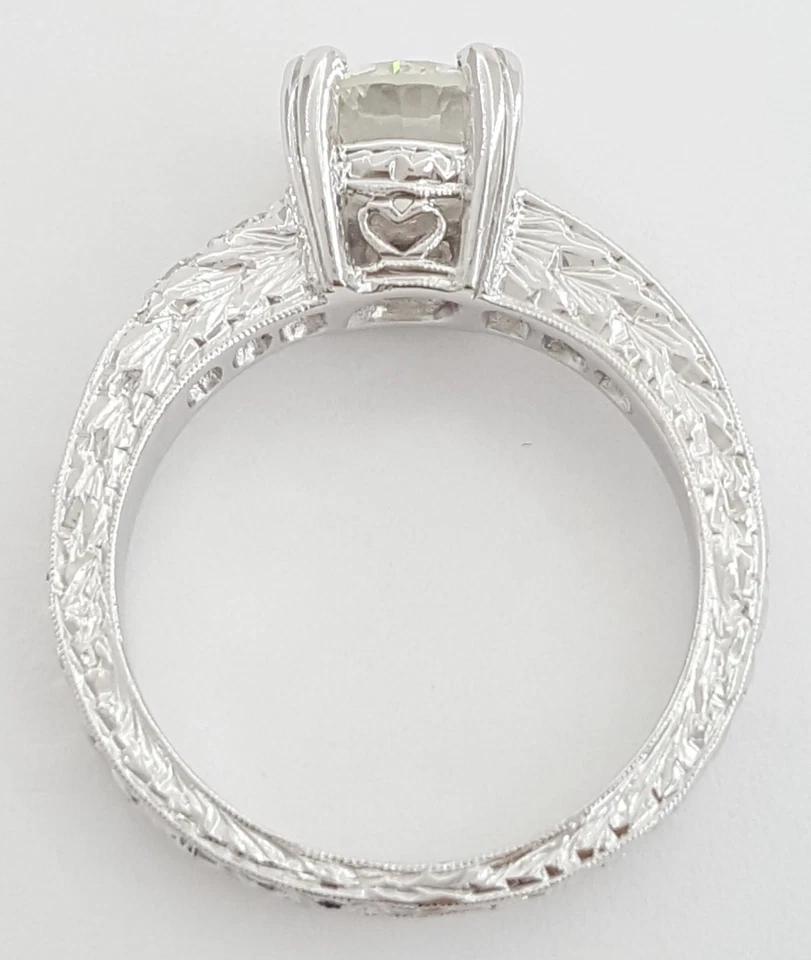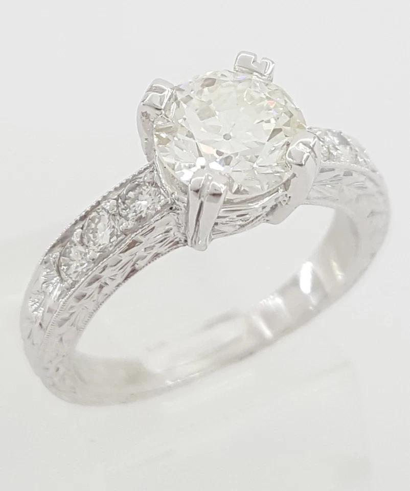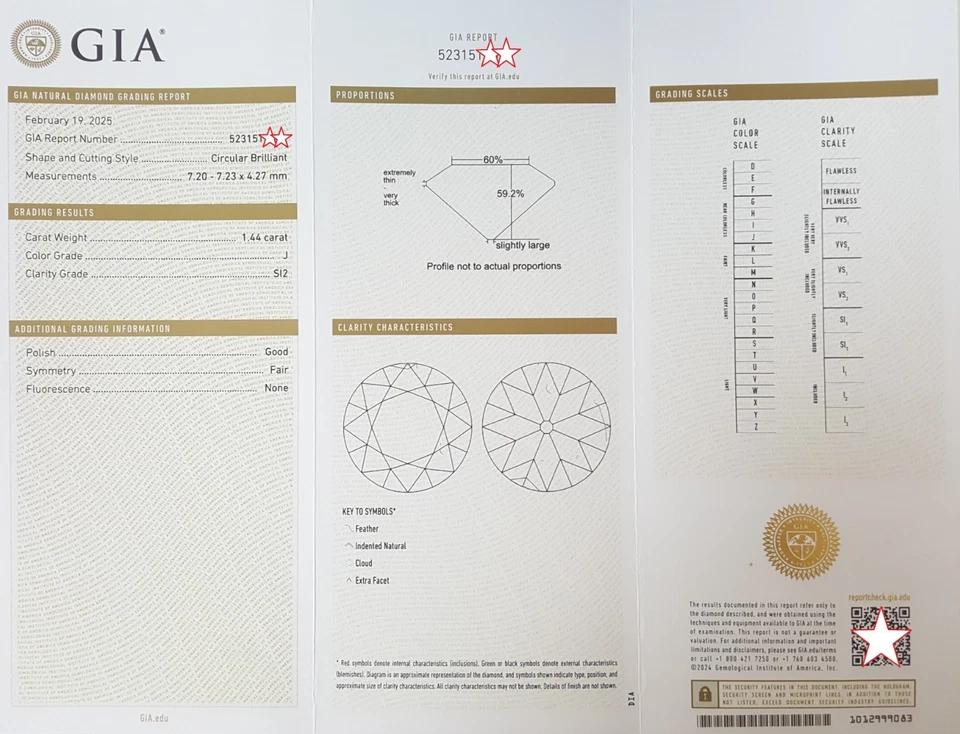 The ring weighs 7.5 grams, size 6, the center stone is a Natural Old European / Circular Brilliant Cut Diamond weighing 1.44 ct, J in color, SI2 in clarity, measuring 7.20 x 7.23 x 4.27 mm, Comes with GIA Certificate #523151****