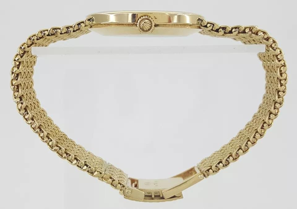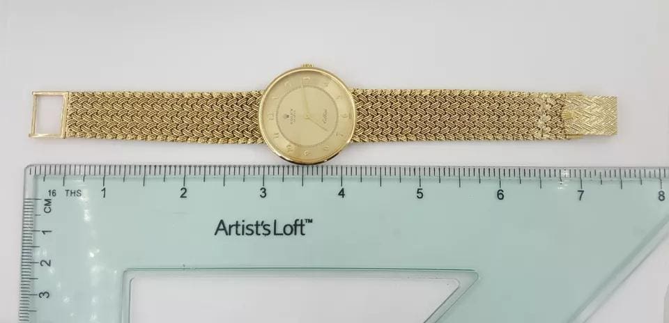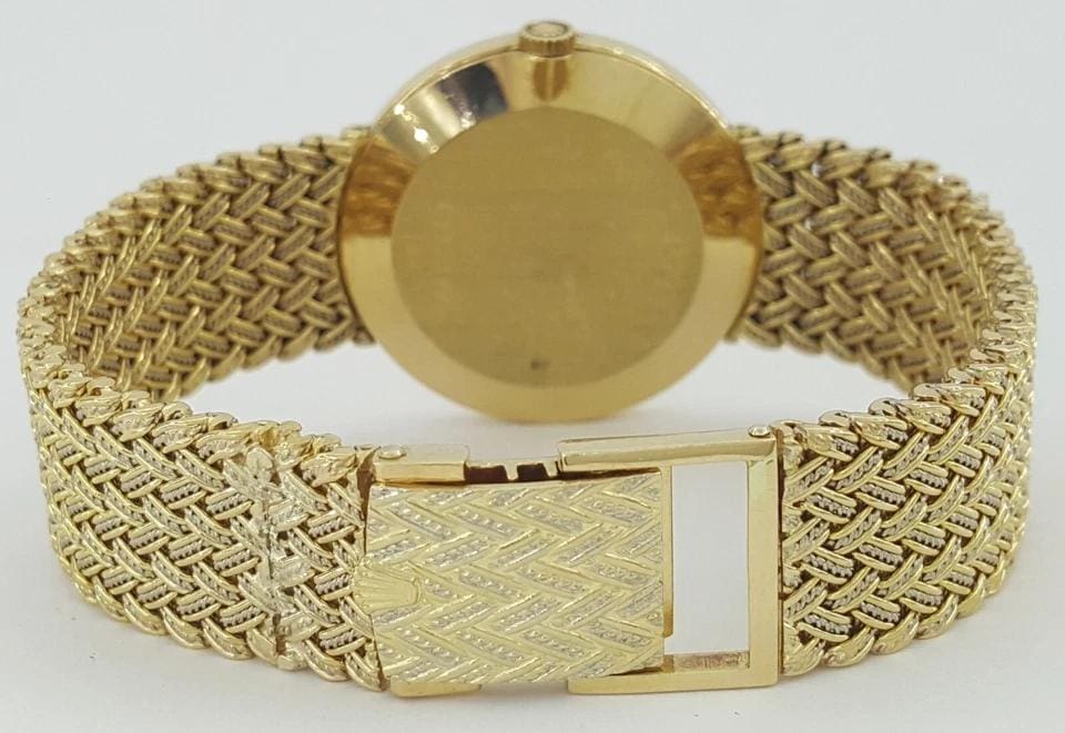 The watch features the original 18k Rolex crown, Smooth Bezel, sapphire crystal, factory champagne with "ROLEXROLEXROLEX" center ring dial, weighs 83 grams of Solid 18k yellow gold, can fit up to a 7.5" wrist with the factory 18k yellow gold weave bracelet that has a solder line from when it was shortened. The watch is in good condition overall, has been checked by our watchmaker to make sure that it keep good time, and comes with a Rolex Box.