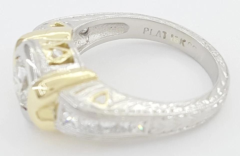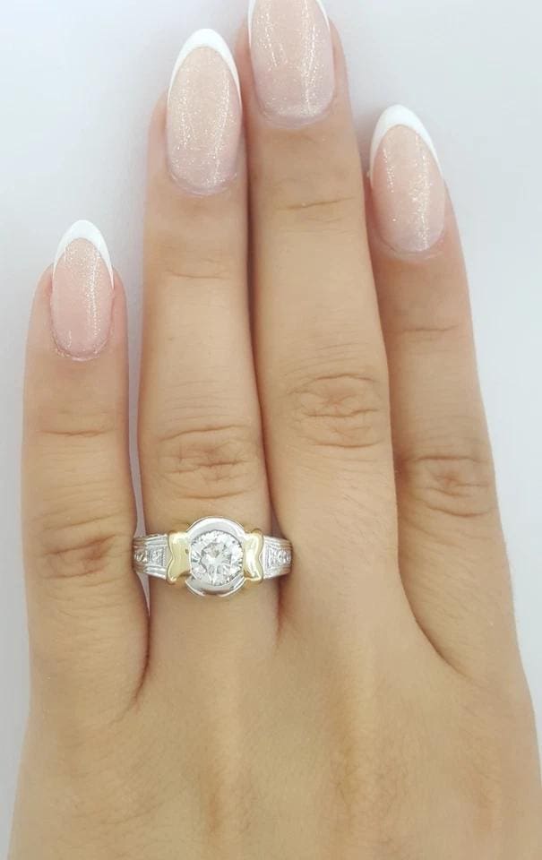 You are purchasing a 1.68 ct total weight Round Brilliant Cut Diamond Bezel Set Engagement Ring in Platinum & 18k Yellow Gold.