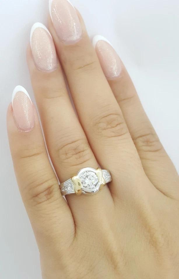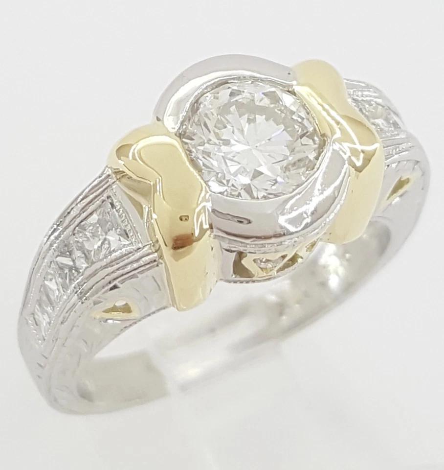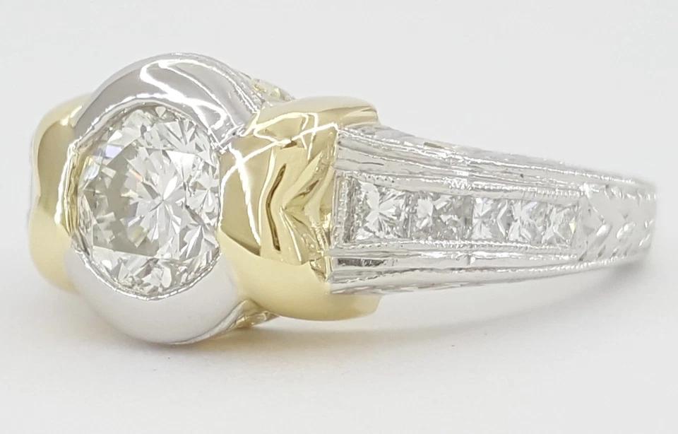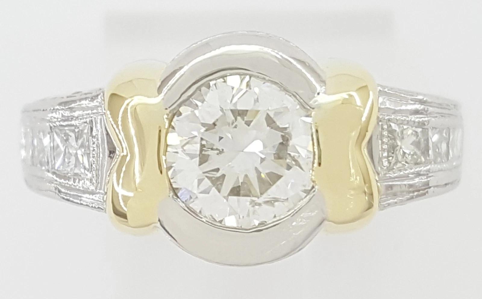 You are purchasing a 1.68 ct total weight Round Brilliant Cut Diamond Bezel Set Engagement Ring in Platinum & 18k Yellow Gold.