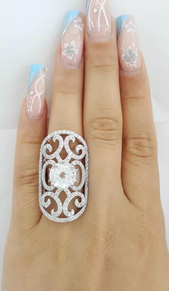 The ring is size 5.25, weighs 8.3 grams, the center stone is a Natural Round Cut White Sapphire weighing 5.48 ct.