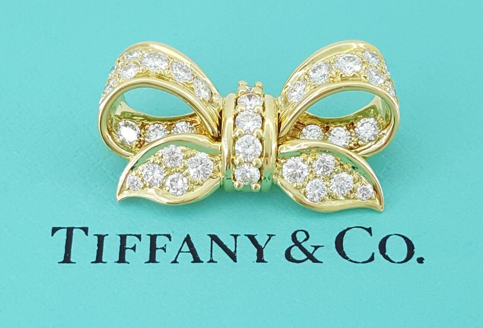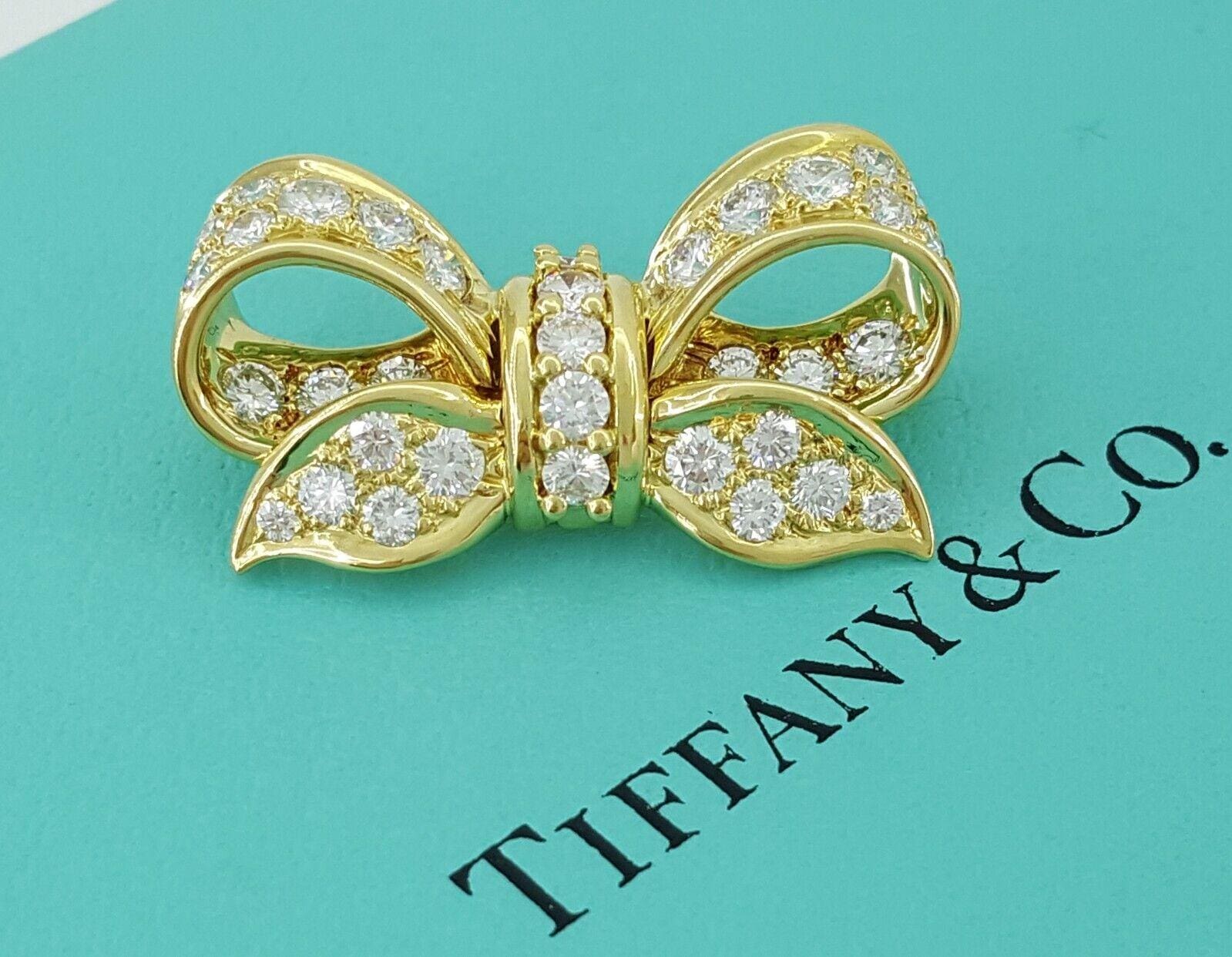 Vintage Tiffany & Co 1.71 ct Diamond Bow Ribbon Brooch Pin 18k Yellow Gold 1.1”