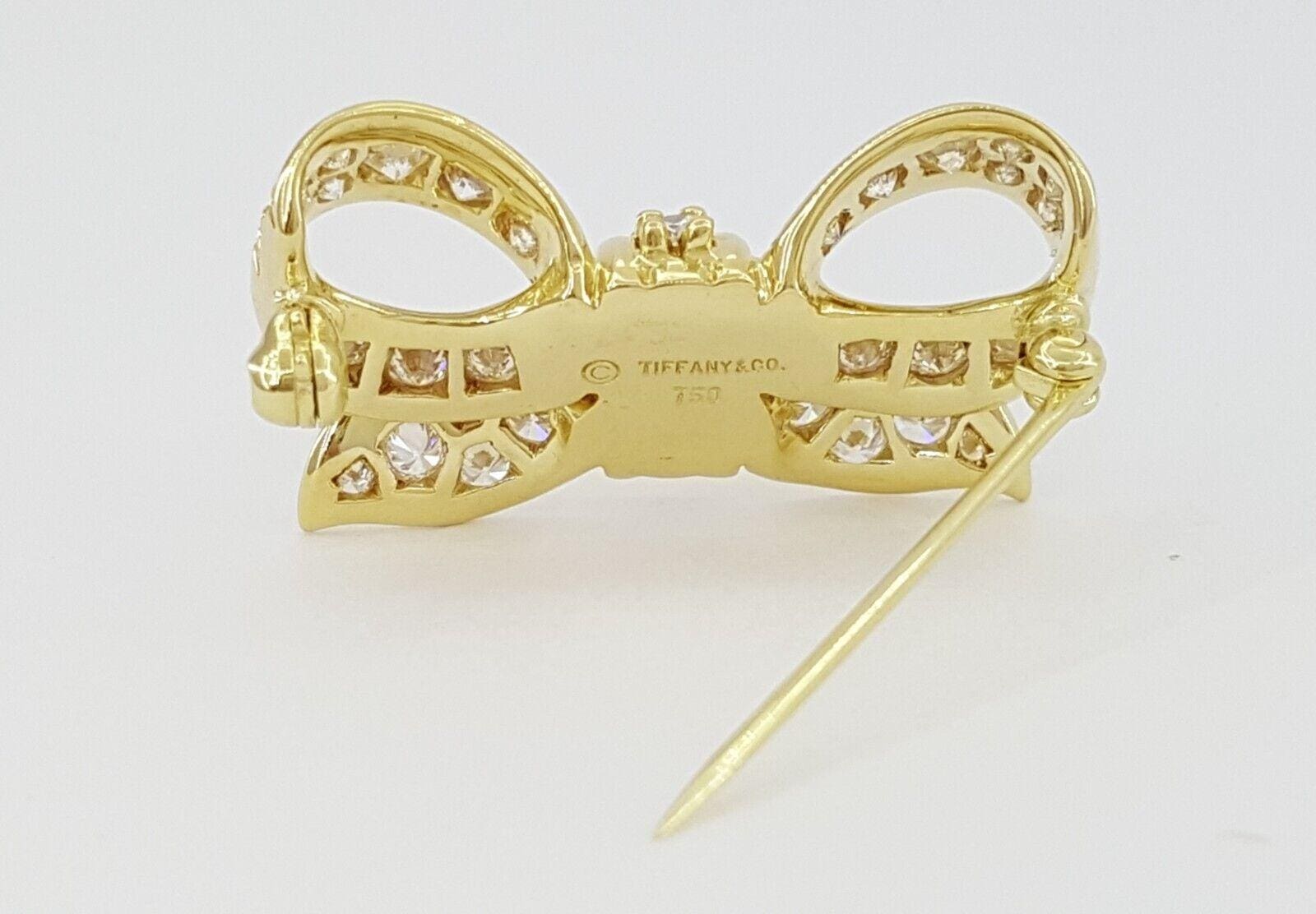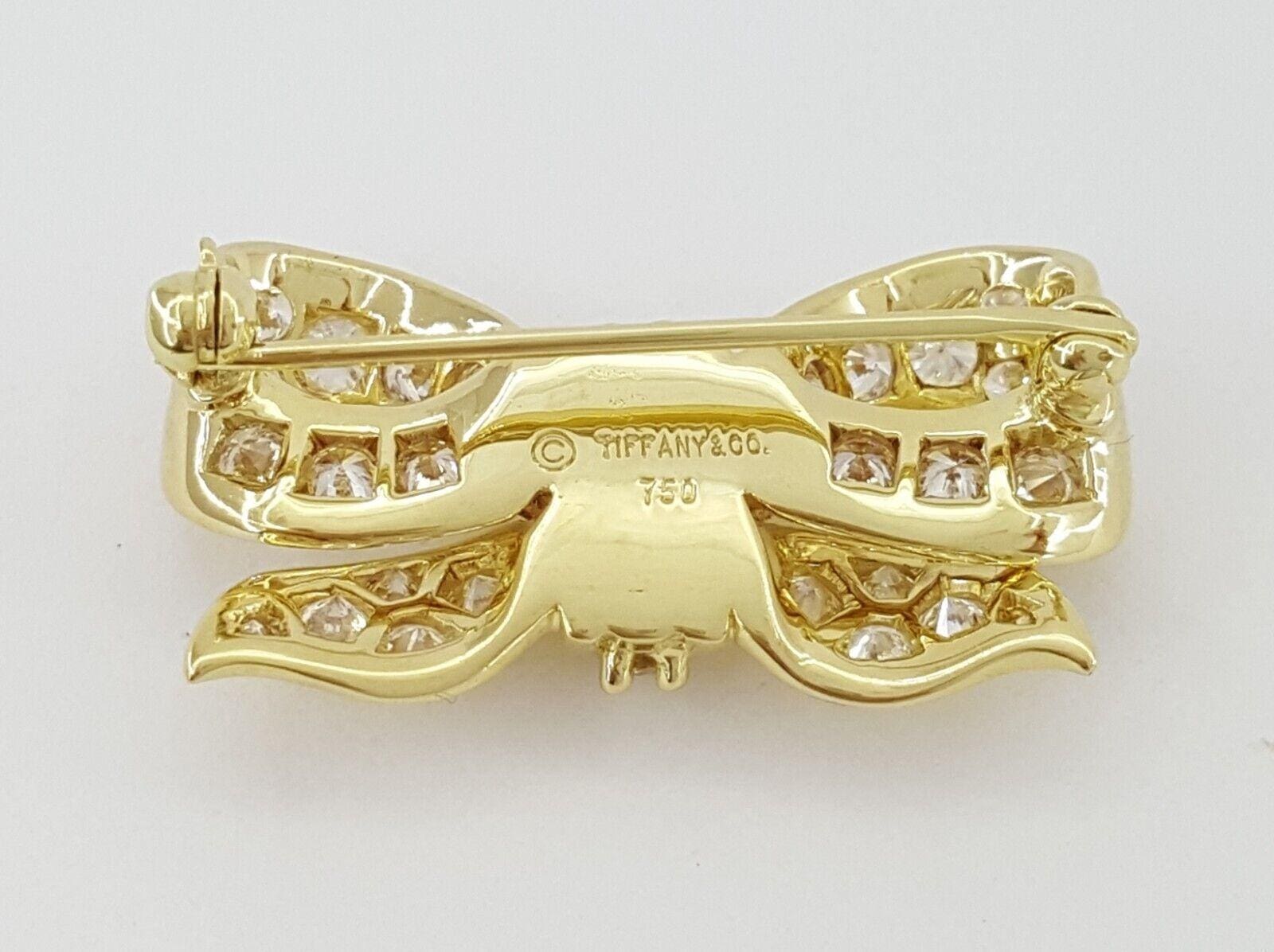 You are Buying an Authentic Tiffany & Co. 18K Yellow Gold 1.71 ct Round Cut Diamond Bow Ribbon Brooch / Pin. The brooch weighs 8 grams, 27.6mm (1.1" Inches) wide, 15.9mm tall, 6.8mm thick, there are 36 Natural Round Brilliant Cut Diamonds weighing approximately 1.71 ct, G+ in color, VS+ in clarity. The brooch is stamped "©TIFFANY&CO 750".